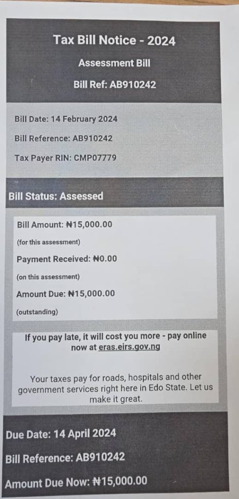 - Upon receiving your complete documents, an Assessment Bill will be generated through the Edo Revenue Administration System (ERAS).
